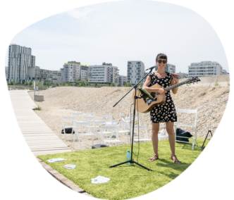 Das Baufeld H5, auf dem zukünftig das Leuchtturmprojekt Pier05 entstehen wird, dient in diesem Sommer als Outdoor-Location. Die dort in Kooperation mit dem Stadtteilmanagement enstandene Nachbarschaftsterrasse wird in den nächsten Monaten zum Treffpunkt mit Aktivitäten für Alle. Das Projekt "Seestadt Stars" bietet Nachwuchs-lokalen Acts und begeisterten Straßenmusiker*innen ab Juli eine Bühne.